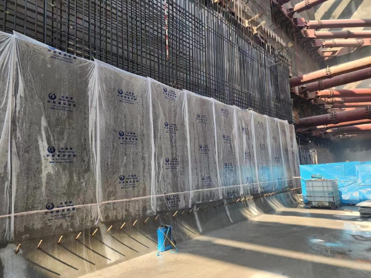 混凝土節水保濕養護膜,是以新型可控高分子吸水材料為核心,以塑料薄膜為載體,通過設備加工復合而成的卷材產品。其中高分子材料可吸收自重200倍的水分子, 吸水膨脹后變成透明的晶狀體,把液態水變成固態水,每平方米養護膜可蓄水0.5KG,成為一個固態的微型水庫,然后通過毛細管的作用向混凝土養護面滲透, 同時不斷吸收混凝土在水化過程中產生的蒸發水,因此在一個養護期內總能保持混凝土表面濕潤。